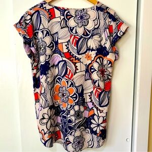Express| Vibrant Floral B-Neck Short Sleeve Blouse in Navy White Coral Sz L