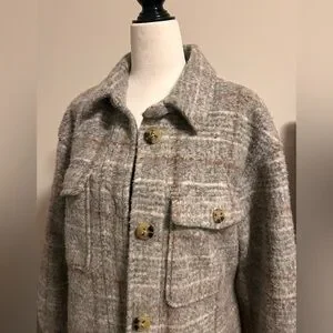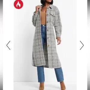 Chic knit Express shacket with a cozy feel. Features a stylish plaid pattern and soft texture.