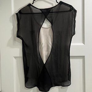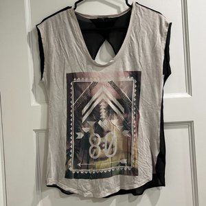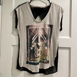 Express top in size Small with a sheer open back. Front graphic print with rhinestone details. Super cute bohemian style. In good gently used condition with some pilling.