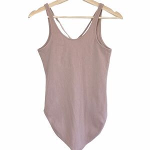 This is a EXPRESS Pink V Neck Ribbed Bodysuit. It has strappy detail on the chest area and there are also button snaps at the bottom for easy wear.