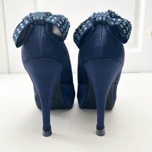 Expression Navy Blue Satin Peep-Toe Platform Heels with Rhinestone Bows Size 7