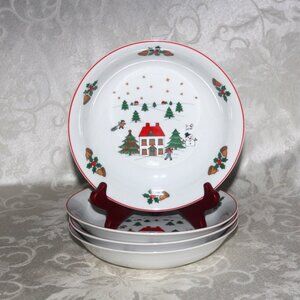 Elevate your holiday table with this exquisite and pristine 20 piece porcelain dinnerware set inspired by Kopin's Christmas Pleasure. The pattern is quintessentially Christmas, with holly and bells, Christmas trees, horse-drawn sleigh, snowman, and snow covered rolling hills.