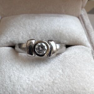 💎 This stunning white gold ring features a clear diamond stone that is bezel-set in the center, surrounded by a smooth polished band that tapers elegantly. The design includes small circular indentations on either side of the stone, adding a touch of sophistication. Its classic style makes it perfect for various occasions.
