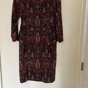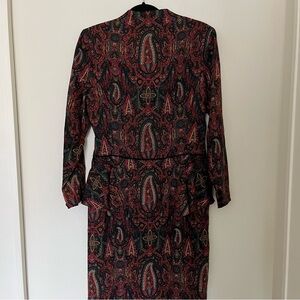 This is an absolutely stunning, heirloom quality piece in impeccable condition from a legendary Japanese couturier. beautifully tailored with velvet covered button, piping detailing at the waist, and a ruffled detail to the peplum at the back. fabric is 100% silk (more of a silk twill) in a lovely paisley pattern. Fully lined. Photos don't do this beauty justice. Likely best fits a 6-8 depending on your measurements, please see measurements.