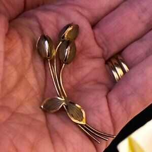 This delicate and finely rendered bouquet is slightly gilded. Created by the renowned Canadian jeweller Bond Boyd, it has (in my eyes) a Scandinavian feel. It measures just over 2 inches. Marked Bond Boyd Sterling and in very nice condition.
