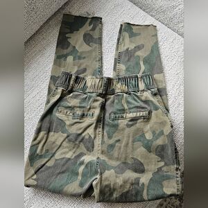 army green print, button closure, elasticized waist, raw hem, size small, good condition