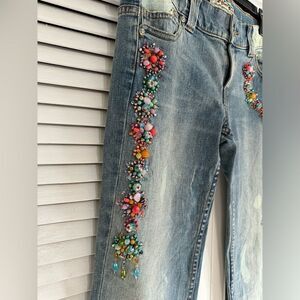 Vintage Extremely Rare Allen B jeans with beautiful jewel and crystal embellishment to create elaborate detailing. Wide bottom leg.