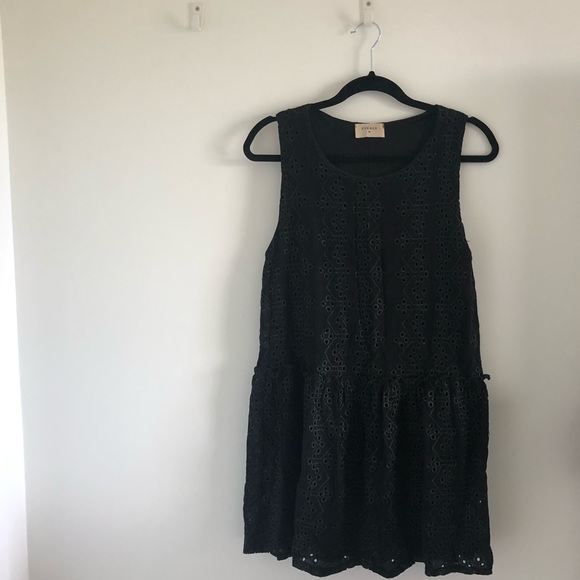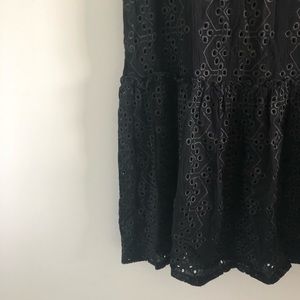 Eyelet drop waist ruffle hem dress. Hangs straight, double lined. Hits above my knee (5’7).