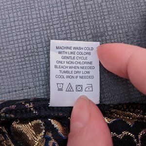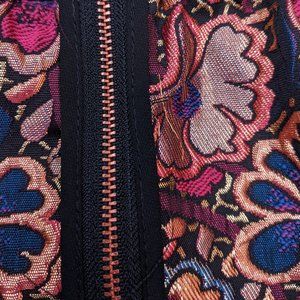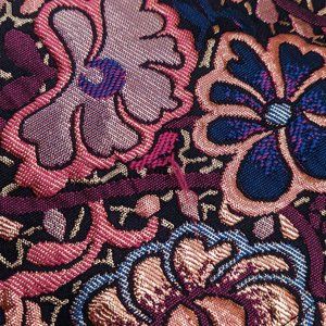 Metallic floral print A-line dress in pink, purple, and gold with black seams. Item was bought used and it has a burst seam on the right side under the armscye which looks like it could be fixed with some simple hand- or machine-stitching. There's also some loose threads around the hem/zipper (see photos). Item is otherwise in good condition.
