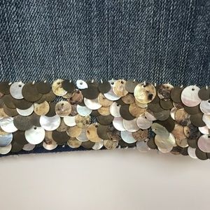 Ezra Fitch by Abercrombie & Fitch Denim Jean Skirt with Incredible Gold, Tan, Pearl Seashell Detail around entire Hem. This Skirt is Gorgeous, Unique & Rare since Abercrombie no longer produces out of its High-End Ezra Fitch line. Size 26. Length 12 inches