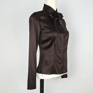 Excellent pre-owned condition, F Carriere women's espresso brown long sleeves silk blend button down blouse with the optional bow at the collar, size XS.