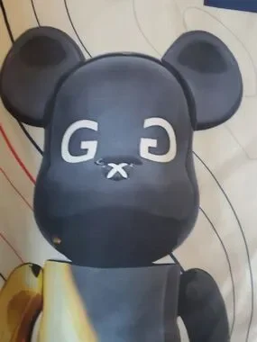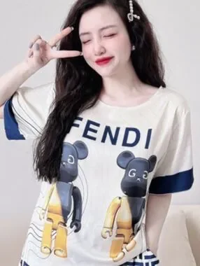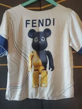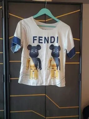 Short sleeve Fendi tee with bold logo. White base with blue sleeve accents. Playful yellow and blue bear graphics at front. Lightweight and casual. Feels like silk