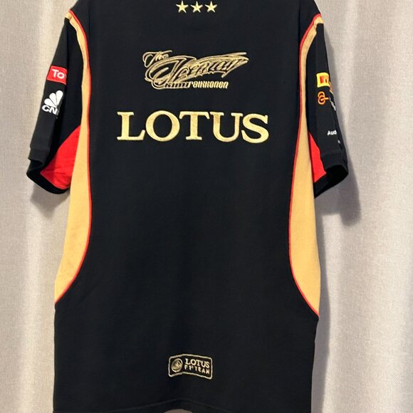 2012 2013 Season - The Iceman Kimi Raikkonen Official Polo Shirt - Worn once on race day at Montreal GP. Black with gold and red accents. Quality embroidered logos stitched on patches.