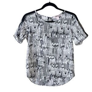 This is a gorgeous thin and light B&W print shirt from F21. Perfect under your blazer, but take that blazer off when you link up with your ladies for drinks after work, because those black sheer shoulder panels need to get shown off! Tuck it in, or wear it out, your choice. This shirt will take your wardrobe styled to the next level! EUC