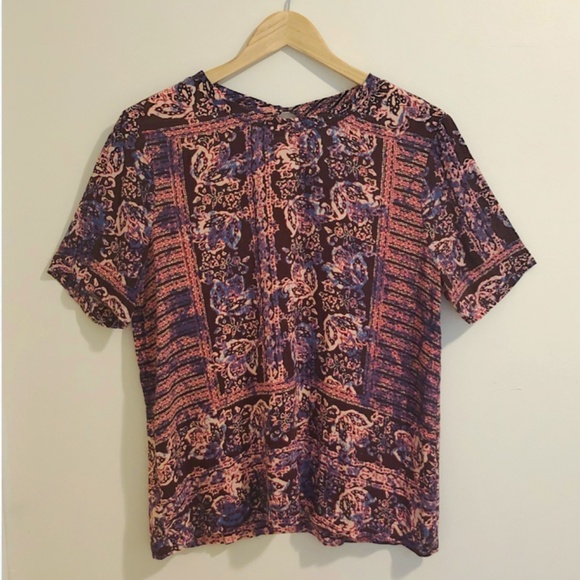 Boxy t-shirt short-sleeve blouse in a purple and pink floral batik-like pattern. It has a small peep-hole cutout at the back and fastens at the neck with a button. Worn once and in great condition.