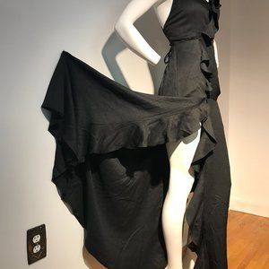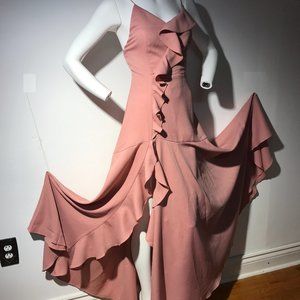 Lightweight and flowing high/ low irregular floor length, open striped back dress; faux wrap; dusty pink peach blush color, perfect for Evening, Prom, Graduation, Weeding, and any Summer day.