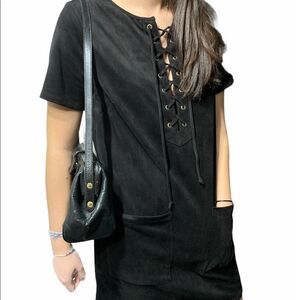 F21 faux suede shift dress in amazing used condition. Has a collar and a crisscross tie design and has two functional pockets in front comes in black. Dress it up or wear it down goes all with a nice chunky belt.
