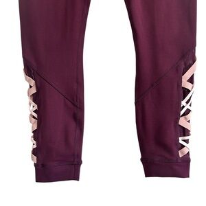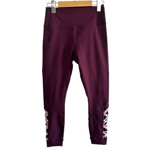 Burgundy and pink leggings with a unique mesh crisscross design on calf