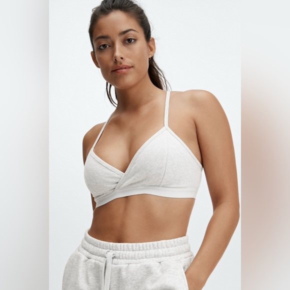Our lounge bralette with a cross-over front has a supportive racerback and thin spaghetti straps, making it a day-off staple.