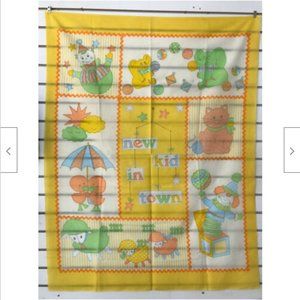 Animal & circus-themed fabric panel in yellow tones with neon greens & corals with "New Kid in Town" in the center.