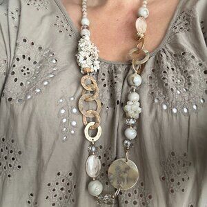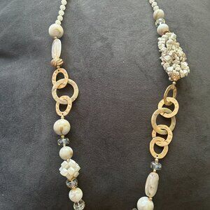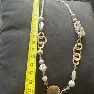 In shade of off white and gold, this necklace will effortlessly complement both casual and dressy outfits!
