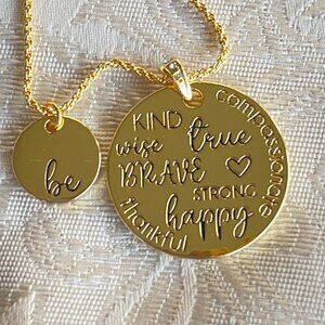 Fifth Avenue Collection Gold Tone Rhodium plated Beautiful Words Medallion & Charm 20" Sweater Necklace. Small disc engraved "BE", larger disc engrave Kind, Wise, Brave, Strong, Happy, Thankful, Compassionate, Bale with Swarovski crystals accent. Comes in giftable pouch. Nickel, lead & cadmium free/hypoallergenic.
