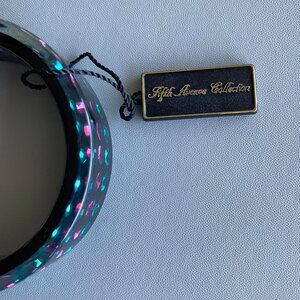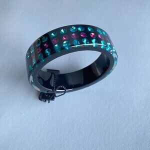 Canadian Brand Fifth Avenue Collection Slip on Stunning glossy black resin bangle with crystal inlay, features 3 continuous rows of teal blue & fuchsia inlayed crystals. interior circumference 8.5”, bangle width: 21mm