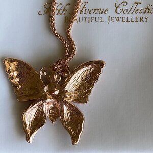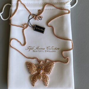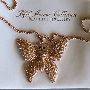 NWT Canadian Brand Fifth Avenue Collection Dazzling 26" Rose Gold Tone Rhodium Plated Swarovski Crystal Butterfly Pendant Necklace. Features pave wings with round crystals along the edges and larger circular crystal in center bezel set, black crystal eyes. lobster claw closure. Hypoallergenic, free from lead, nickel & cadmium.
