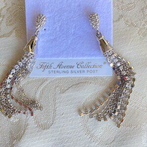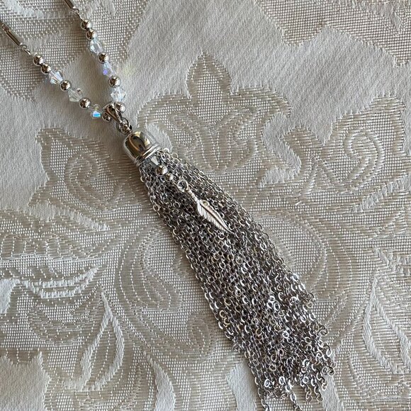 Fifth Avenue Collection 30" Tassel Necklace & Earrings with Swarovski Crystal accents & leaf charm. Dangle 3.5" long earrings with pave crystal studs & cascading tassels of chains & crystal strands. Necklace tassel has no crystals, but dangling leaf charm is in center, above the pendant are faceted crystals.