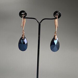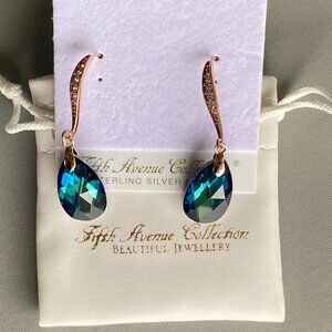 Canadian Brand Fifth Avenue Collection, Rhodium plated rose gold tone Genuine Swarovski Crystal Tear Drops, showcasing incredible depth of colour shifting between teal, sapphire blue and vibrant emerald green depending on the light & angle. The rose gold tone Shepherd's hook style is adorned with crystals down the elongated curve, sterling silver hooks. Free of lead, nickel & cadmium, hypoallergic.