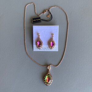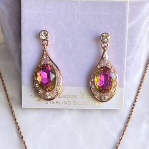 New With Tags, Fifth Avenue Collection Swarovski Teardrop shape Crystal Necklace & Earrings Set. rhodium plated rose gold tone, Multi colour oval crystals with clear smaller round crystals. 18" chain + pendant: 1.5", earrings length: 1.5". Comes in box pictured. Nickel, lead & cadmium free, hypoallergenic.