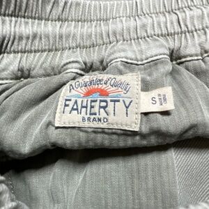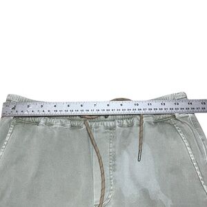 In good overall condition except for faded mark on the top visible in photos. (Reflected in price). Looks more apparent in photos than under natural light. Side pockets; back pockets. Sage green. Drawstring and elasticized waist. Photos are important so please check all for condition, detail and measurements.