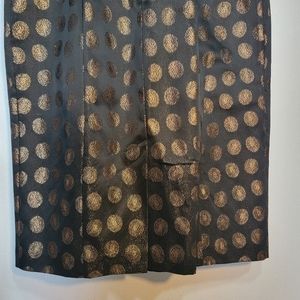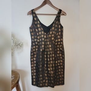 FAIRWEATHER Retro Black and Gold circle pattern mini dress V-neck. Zip up.