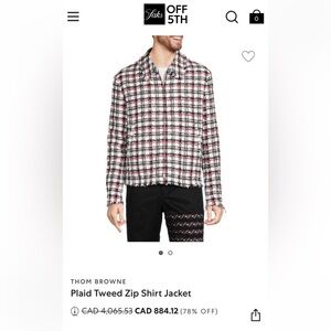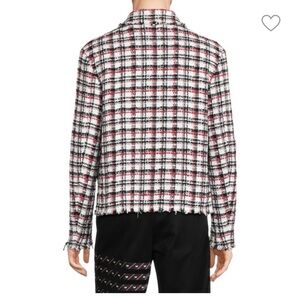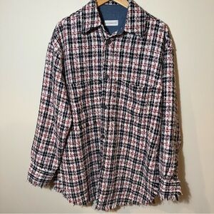 Long sleeve tweed shirt in tones of navy, red, white, and metallic silver-tone. Spread collar. Button closure at front. Patch pockets at chest. Vented side-seams. Box pleat at back. Single-button barrel cuffs. Raw-edged drop-front hem. Tonal stitching.