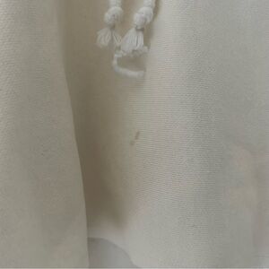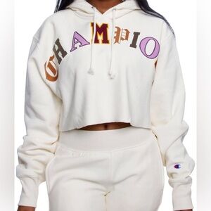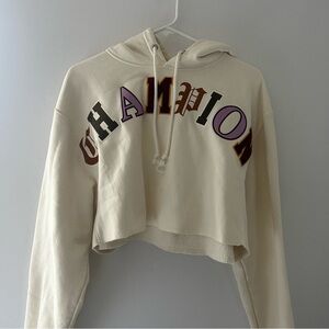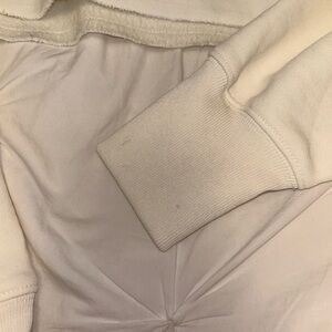 Champion Crème Cropped Reverse Stitch Sweater. Getting rid of all my sweaters. It does have a couple stains on the middle of the shirt and on the sleeve from makeup, i haven’t tried to get them out but I’m sure they would come out easily with some resolve. Other than the couple times i have worn it, it’s basically new. The fuzz on the inside is still there, just happened to get makeup on it the first wear.