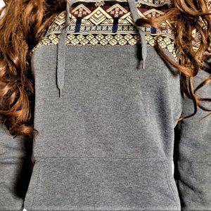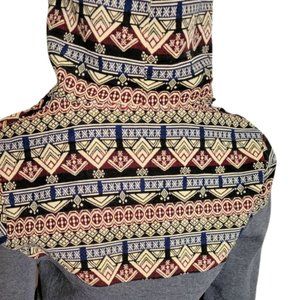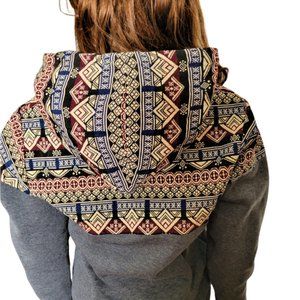 This Unique Hoodie is made from a Tapestry Fabric as well as a dark charcoal fleece fabric.