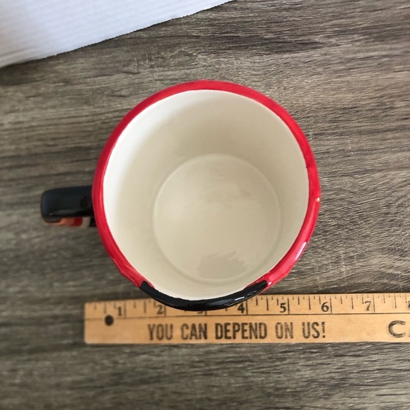 Charming nutcracker-themed mug. Features bold red and black colors. Perfect for holiday drinks.