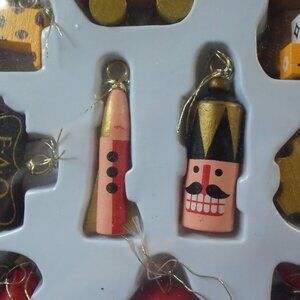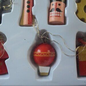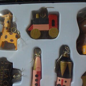 Set of 10 (ten) wooden Christmas tree ornaments from FAO Schwarz.