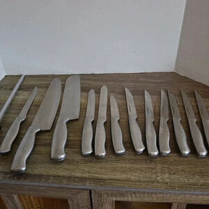 Knife set with six steak knives, a sharpening tool and six additional food prep knives.
