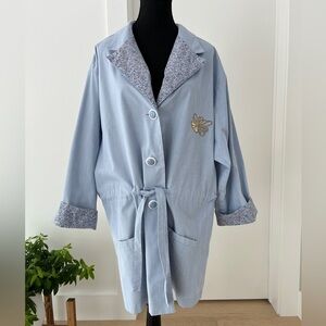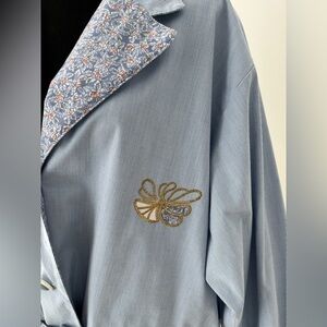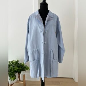 Farini blue and white thin pinstripe vintage jacket is made in Canada. Floral accents on the collar, pockets, notch lapels and roll up sleeves. 3 buttons and a drawstring tie waist for a customized fit. There is a sweet floral embroidery on the left front. 65% polyester/35% cotton blend.