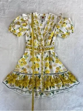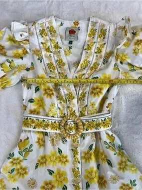 Yellow floral print, this dress features several distinct design elements:
