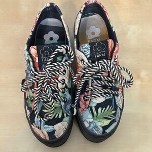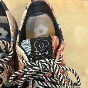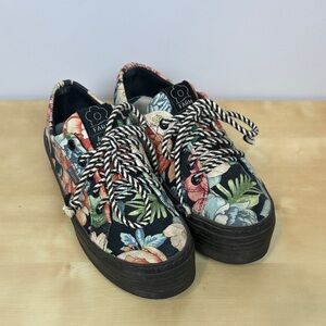 Colorful sneakers with floral patterns. Features a mix of vibrant hues. Stylish and unique design.