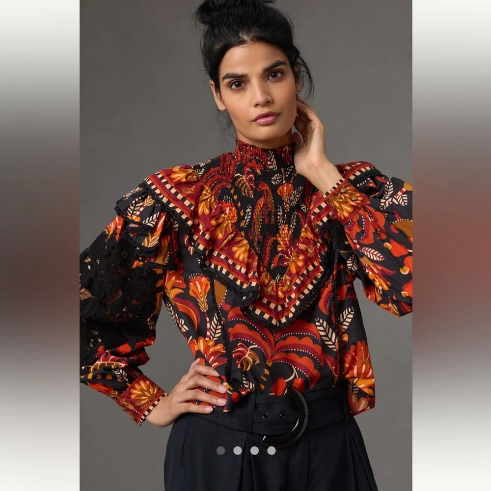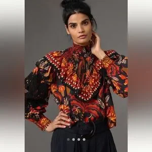 Do you not believe how incredibly gorgeous this top is ! So elegant distinct and beautiful! It’s a vibrant floral design; High neck with ruffle details. Long sleeves with lace accents.