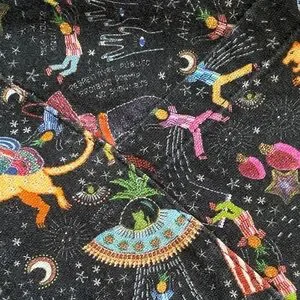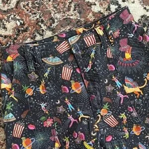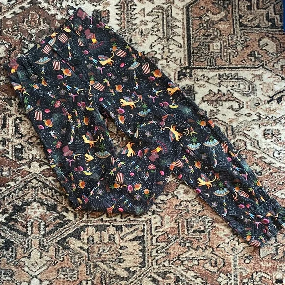 Vibrant patterned pants with playful design. Comfortable fit. Perfect for casual outings.