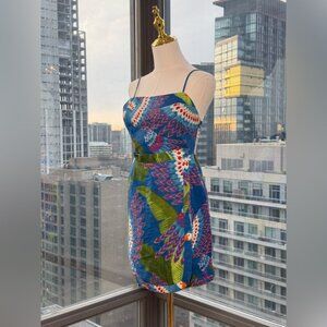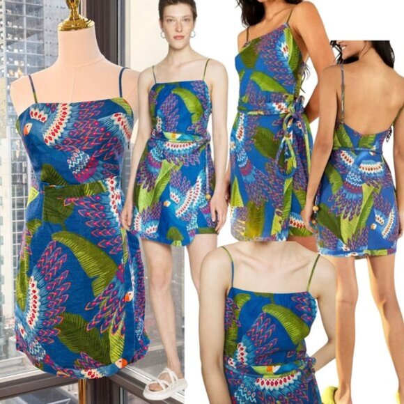 🆕 FARM Rio 🧿 NWOT Blue Macaw Linen Mini Dress, Sz XS *MISSING BELT*