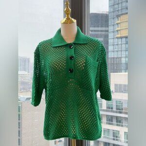 🆕 FARM Rio 🧿 NWOT Kelly Green Crochet Collared Polo, Sz L