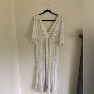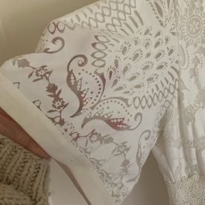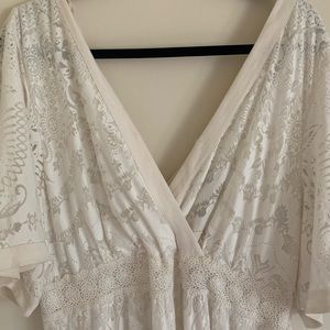 Elegant white midi dress by FARM Rio. Features intricate lace detailing. Perfect for any occasion.