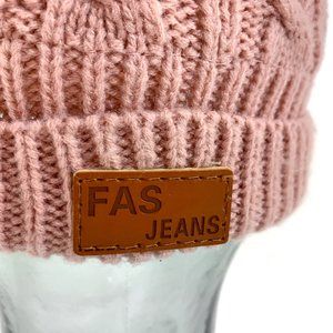 This adorable girls beanie cap (or Canadian toque) from FAS Jeans is perfect for keeping your little one's noggin warm and stylish during the winter season. Features a cable knit pattern in pink with two faux fur pom-poms on top, warm fleece lining and FAS leather logo on brim. Size: 45-54cm/17.7”-21.3” head circumference. Suitable for 12 mos - 5 yrs. Colour: Pink. Material: 100% acrylic. EXCELLENT pre-owned condition.