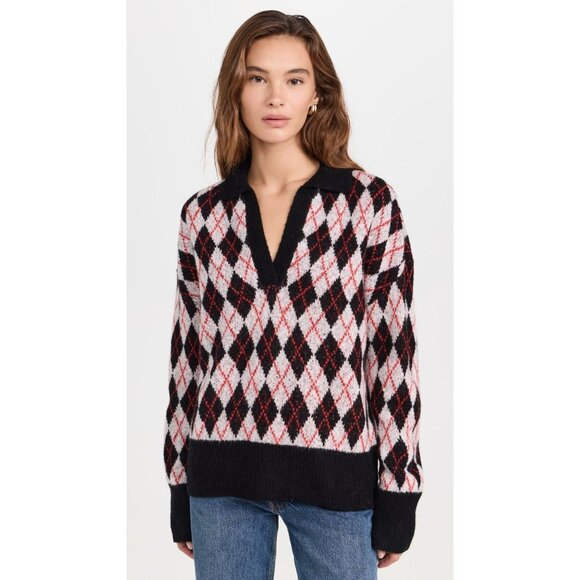 FAVORITE DAUGHTER Aria Black Red Argyle Wool Cashmere Knit Polo Sweater, Size S