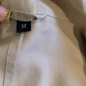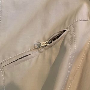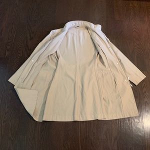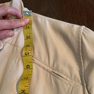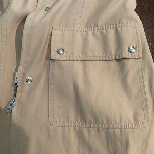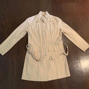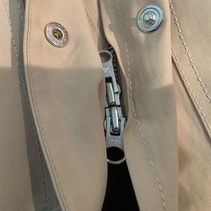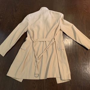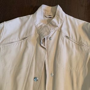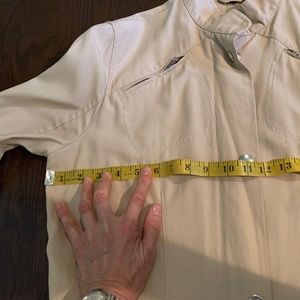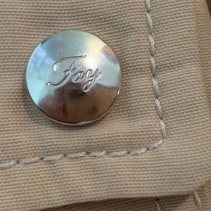 Beautiful Fall jacket by the high fashion brand FAY. Bought in Italy a few years ago. Light beige colour, easy to match. Double sized zipper and snap closures at front. Zipper closures at top pockets and snaps at patch pockets. Self belt. Embossed FAY snaps and zip pullers. This is a very nice jacket, with great workmanship as known with this brand. As this is a European size Med, I measured chest circf. (1 inch below as photo) to be 41" and back length from high point shoulder to be 35".